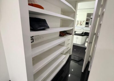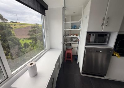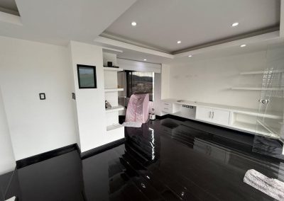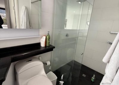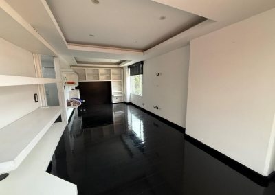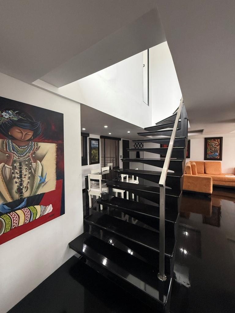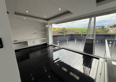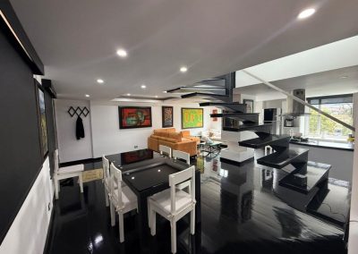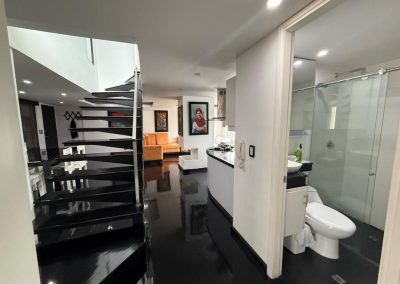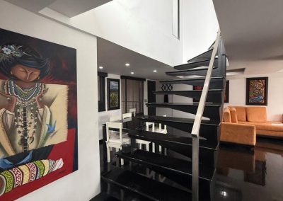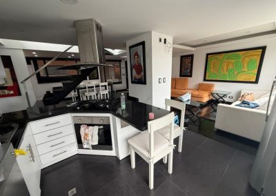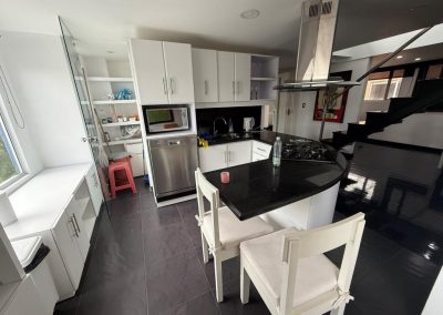 Acabados de calidad: piso en pino pintado, cocina en mármol, ventanales y divisiones en vidrio
